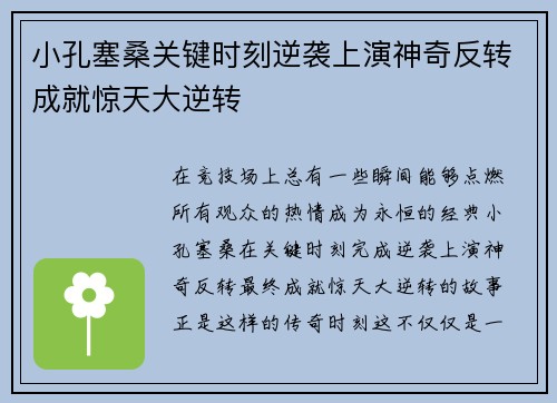 小孔塞桑关键时刻逆袭上演神奇反转成就惊天大逆转